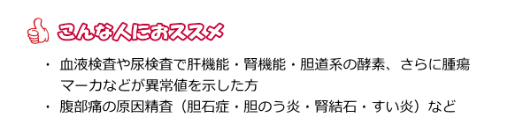 主に、すい臓・肝臓・胆のう・胆管・腎臓・ひ臓・腹部大血管の観察をします。検査時間は15分程度です。各臓器の腫大(しゅだい)や萎縮の程度、腫瘍、ポリープ、結石の有無、さらに血流異常などがわかります。 |